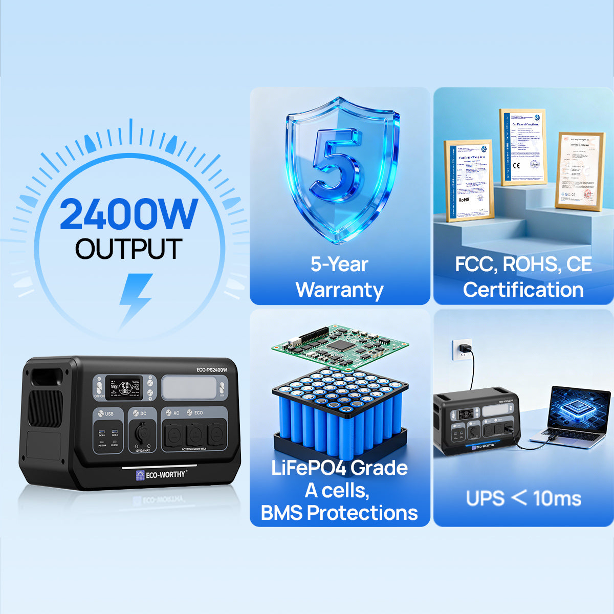 [Розширений захист BMS для повної безпеки]: PS2400, виготовлений з високоякісного LiFePO4 акумулятора, пропонує термін служби до 10 років. Його інтелектуальна система керування акумулятором (BMS) забезпечує комплексний захист, включаючи захист від перевантаження по струму, перенапруги, зниженої напруги, перевантаження, короткого замикання та перегріву, а також інтелектуальну систему охолодження з контрольованою температурою та автоматичний вимикач перевантаження змінного струму. Сертифіковано відповідно до стандартів FCC, RoHS та CE для безпечного та безтурботного використання електроенергії.