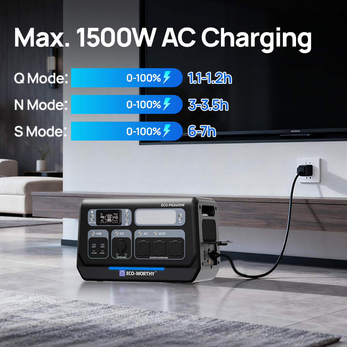 [Кілька варіантів заряджання | Швидке повне перезаряджання]: Підтримує заряджання від мережі змінного струму (до 80% лише за 56 хвилин), сонячне заряджання потужністю до 1200 Вт та заряджання від автомобіля. Підтримується наскрізне заряджання, що дозволяє одночасно заряджати та розряджати пристрій для безперебійного живлення.