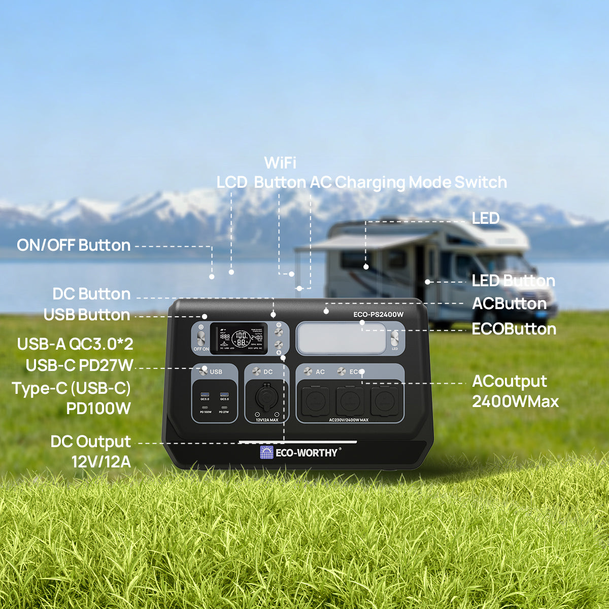 [10 виходів, величезна ємність 2048 Вт·год]: ЕКОЛОГІЧНИЙ PS2400 забезпечує ємність 2048 Вт·год з номінальною потужністю 2400 Вт і має 10 універсальних вихідних портів, що підтримують до 99% побутової та вуличної техніки, включаючи холодильники, кавоварки, чайники, смартфони та інші мобільні пристрої. Надійне рішення для аварійного резервного копіювання та зберігання енергії для будинків на колесах, кемпінгу та домашнього використання.